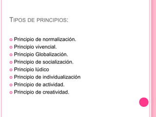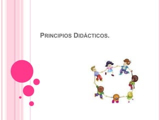 Este documento describe varios principios didácticos como la normalización, vivencial, globalización, socialización, lúdico, individualización, actividad y creatividad. Explica cada principio y cómo se aplican en el aula, destacando la importancia de la actividad del alumno, el trabajo en grupo, y el uso del juego y la creatividad para que los estudiantes aprendan de manera significativa.