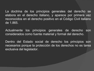 Este documento resume los principios generales del derecho en Colombia. Explica que estos principios son criterios que guían las relaciones humanas y que se utilizan para interpretar leyes y llenar vacíos legales. Luego describe algunos principios específicos como el enriquecimiento sin causa, abuso de derechos, buena fe, error común hace derecho, fraude a la ley e imprevisión. Finalmente, menciona que estos principios están consagrados en la Constitución colombiana de 1991.