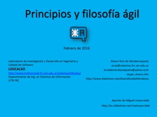 El documento presenta los principios y la filosofía ágil en el desarrollo de software, enfatizando la importancia de la adaptación a cambios y la colaboración entre equipos. Se discuten los beneficios del enfoque ágil frente al tradicional, destacando la entrega continua de software funcional y la comunicación efectiva. Se basa en el Manifiesto Ágil y sus principios, promoviendo la agilidad como una respuesta efectiva a las necesidades cambiantes de los clientes.