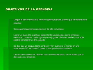 El documento describe los principios y objetivos de la ofensiva en baloncesto. Explica que la ofensiva debe ser rápida pero no desordenada, involucrando a 2-3 jugadores para obtener tiros cómodos antes de que la defensa se organice. También destaca la importancia de aplicar fundamentos ofensivos como el triple amenaza, cortes en V y pantallas para ganar ventaja numérica sobre la defensa.