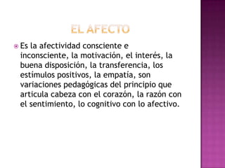 El documento describe los principios de una nueva pedagogía que se centra en el niño. Reconoce la naturaleza espontánea del niño y propone partir de su experiencia natural como principio y fin de la educación. Además, sugiere que el ambiente escolar lo diseñe el propio alumno para aprender lo que le interesa y que el maestro proponga nuevas preguntas y desafíos en lugar de respuestas. Finalmente, señala que el trabajo en grupos pequeños favorece el desarrollo intelectual y moral de los