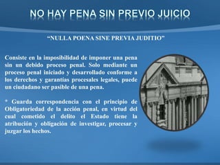 El documento resume los principios y garantías del debido proceso penal, incluyendo la prohibición de imponer una pena sin juicio previo, la presunción de inocencia, el derecho a no autoincriminarse, la publicidad de los procesos, y el principio de que ante la duda se debe fallar a favor del acusado.