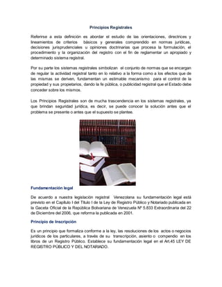 2) El principio de publicidad, que exterioriza las situaciones jurídicas registradas para generar su conocimiento general.