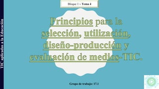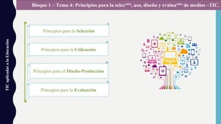 El documento describe los principios para la selección, uso, diseño y evaluación de las tecnologías de la información y la comunicación (TIC) aplicadas a la educación. Explica que la selección de las TIC debe considerar objetivos, contenidos, características de estudiantes y profesores, y contexto. Además, detalla las etapas del diseño, producción, posproducción y evaluación de las TIC, incluyendo autoevaluación, juicio de expertos y evaluación por los usuarios.