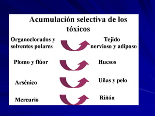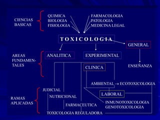 Este documento presenta una introducción a los principios básicos de la toxicología. Explica las diferentes áreas, ramas y clasificaciones de la toxicología. También describe conceptos clave como xenobióticos, toxicocinética, relación dosis-respuesta, espectro de efectos indeseables, interacción de sustancias químicas, clasificaciones de intoxicaciones, diagnóstico de intoxicaciones, medidas de primeros auxilios y estudios de toxicidad en animales.