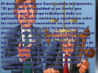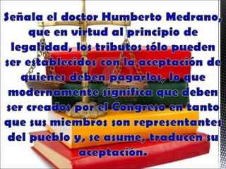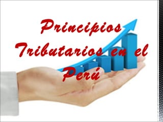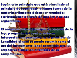 El documento establece los principios tributarios en el Perú. Señala que los tributos solo pueden ser creados, modificados o derogados por ley o decreto legislativo. También establece que los gobiernos regionales y locales pueden crear, modificar y suprimir contribuciones y tasas dentro de su jurisdicción. Explica que el Estado debe respetar los principios de reserva de ley, igualdad y respeto a los derechos fundamentales cuando ejerce su potestad tributaria.