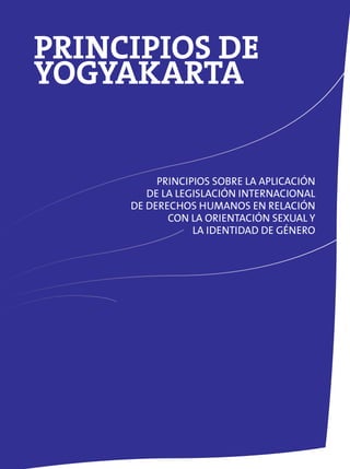 Este documento presenta los Principios de Yogyakarta, los cuales establecen las normas internacionales de derechos humanos aplicables a cuestiones de orientación sexual e identidad de género. Un grupo de expertos en derechos humanos adoptó estos 29 principios, los cuales afirman que todas las personas, independientemente de su orientación sexual o identidad de género, tienen derecho al pleno goce de todos los derechos humanos de acuerdo a la legislación internacional. Los principios también incluyen recomendaciones detalladas dirigidas