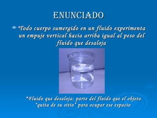 El documento explica el principio de Arquímedes a través de experimentos. Indica que un objeto sumergido en un fluido experimenta un empuje hacia arriba igual al peso del fluido desplazado. Explica que cuando un objeto se sumerge parcialmente, el empuje es menor. También indica que si un objeto está lleno del fluido, su peso aparente es igual al empuje del fluido.