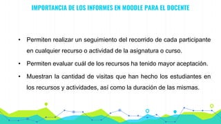Este documento describe la importancia de los informes en Moodle para el docente, los cuales permiten realizar un seguimiento del progreso de los estudiantes y evaluar cuáles recursos son más populares. Se incluyen capturas de pantalla de dos tipos de informes y una explicación de por qué son útiles, especialmente para proporcionar retroalimentación personalizada a cada estudiante.