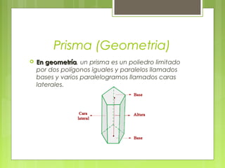 Un prisma es un poliedro limitado por dos polígonos iguales y paralelos llamados bases y varios paralelogramos llamados caras laterales. Existen diferentes tipos de prismas como prismas regulares, irregulares, rectos, oblicuos y más. En óptica, un prisma puede ser usado para refractar y descomponer la luz blanca en los colores del arco iris.
