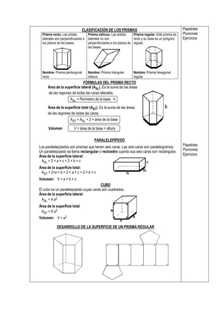 Este documento presenta una lección sobre prismas en matemáticas. Explica que los prismas son sólidos geométricos limitados por dos bases paralelas y caras laterales que son paralelogramos. Define los diferentes tipos de prismas y sus elementos. Incluye fórmulas para calcular el área de la superficie y el volumen de prismas rectos y paralelepípedos. Finaliza con ejercicios prácticos sobre prismas.