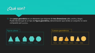 Este documento describe los cuerpos geométricos tridimensionales de los prismas y las pirámides. Explica que los prismas son poliedros irregulares con dos bases paralelas iguales y caras laterales en forma de paralelogramos, mientras que las pirámides tienen una base poligonal y caras triangulares que convergen en un vértice común. Además, clasifica los prismas y pirámides según sus características geométricas como la forma de sus bases, si son rectos u oblicuos, y el
