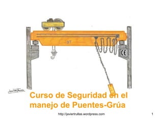 Este documento proporciona instrucciones para el manejo seguro de puentes grúa. Explica los objetivos de un curso de seguridad sobre puentes grúa, que incluyen sensibilizar a los trabajadores sobre prevención de riesgos laborales y cumplir con la normativa. También describe los componentes principales de un puente grúa, como el puente, el carro y el gancho, así como los movimientos básicos como la traslación, orientación y elevación-descenso. Hace hincapié en la importancia de la form