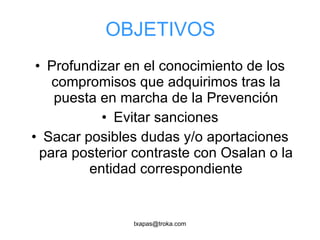 Este documento resume los principales requisitos legales en materia de prevención de riesgos laborales para empresas de turismo activo en España. Explica las obligaciones de los empleadores y trabajadores, así como los diferentes mecanismos de organización de la prevención como servicios propios, servicios ajenos o designación de trabajadores. También destaca la importancia de la evaluación de riesgos, la vigilancia de la salud de los trabajadores y la documentación requerida.