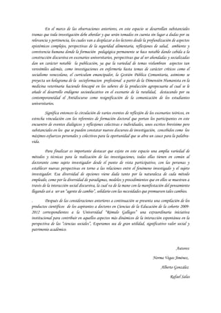 El documento presenta una compilación de resúmenes de tesis doctorales de estudiantes de la Universidad Nacional Experimental de los Llanos Centrales "Rómulo Gallegos". Aborda temas como la seguridad alimentaria, la salud, el medio ambiente, la educación socialista en Venezuela y el desarrollo endógeno en áreas rurales. El objetivo es difundir la producción intelectual de los estudiantes y posicionar el doctorado en la comunidad académica.