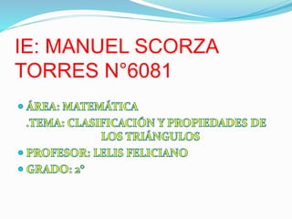 Este documento define un triángulo como una figura geométrica formada por tres puntos no colineales unidos por tres segmentos. Describe los elementos de un triángulo como vértices, lados y ángulos. Clasifica los triángulos según sus lados o ángulos. Explica tres propiedades fundamentales de los triángulos: la suma de los ángulos internos, la relación entre ángulos exteriores e interiores, y que la suma de los ángulos exteriores es 360°. Finalmente, presenta ejemplos para calcular