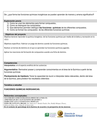 Este proyecto pedagógico propone el uso de juegos didácticos como el dominó químico para facilitar el aprendizaje de las funciones químicas inorgánicas de manera lúdica. El dominó químico asocia nombres y fórmulas de compuestos para identificar su función química. Se realizarán actividades como la identificación de funciones usando la tabla periódica, esquematización de reacciones y prácticas de laboratorio. El proyecto concluye con un torneo de domin