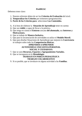 Este documento proporciona recomendaciones para el diseño de situaciones de aprendizaje. Sugiere que los criterios de evaluación del nivel sirvan como referencia, que se temporalicen por trimestres y que los contenidos se seleccionen a partir de ellos. Además, recomienda que las situaciones de aprendizaje sean viables y tengan en cuenta los intereses, entorno y motivación del alumnado de manera inclusiva, utilizando el modelo de Merrill y fomentando competencias básicas.
