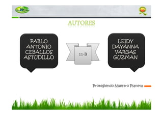 Este documento presenta un proyecto realizado por un grupo de estudiantes llamado "Protectores Ecológicos Provincia de Quebec" para promover la protección del medio ambiente. El proyecto incluyó una caminata educativa al Parque EntreNubes, un foro para aumentar el conocimiento sobre el parque, y una encuesta para evaluar los resultados. La meta del proyecto era enseñar conceptos ambientales a la comunidad estudiantil y formarlos para ser líderes en la protección del medio ambiente.