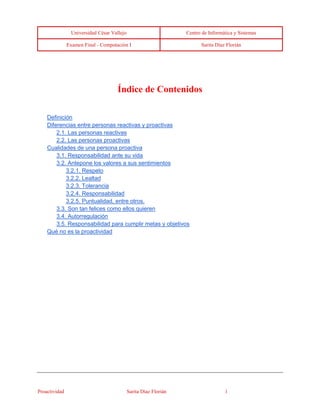 El documento define la proactividad como una actitud activa en la que las personas asumen el control de su conducta y toman iniciativa para generar mejoras. Explica las diferencias entre personas reactivas, que se ven afectadas por las circunstancias, y personas proactivas, que se centran en lo que pueden influir. También describe las cualidades de una persona proactiva como la responsabilidad y la autorregulación para cumplir metas. Finalmente, señala que la proactividad no es lo mismo que la hiperactividad y que las personas proactivas se mue