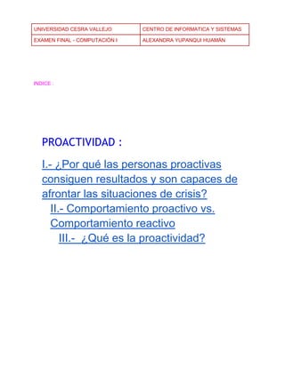 El documento describe la proactividad y cómo difiere del comportamiento reactivo. Explica que las personas proactivas toman la iniciativa para lograr resultados y enfrentar crisis, mientras que las personas reactivas solo reaccionan a los eventos. Define la proactividad como asumir la responsabilidad de hacer que las cosas sucedan en lugar de simplemente reaccionar, y enfatiza la importancia de la proactividad para el éxito profesional en un contexto laboral cambiante.