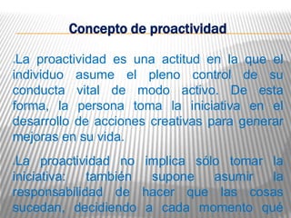 Este documento presenta la definición de proactividad y cómo aplicarla en la vida cotidiana. La proactividad significa asumir el control activo de la propia conducta y tomar la iniciativa para generar mejoras. Las personas proactivas reconocen su responsabilidad de hacer que las cosas sucedan y toman acciones anticipadas para identificar y resolver problemas. Ser proactivo requiere adoptar una actitud de iniciativa y superar los obstáculos en lugar de dejarse vencer por ellos.
