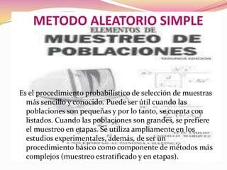 Este documento describe el método de muestreo aleatorio simple. Explica que este método consiste en seleccionar elementos de una población de manera aleatoria de tal forma que todos los elementos tengan la misma probabilidad de ser elegidos. Detalla que este método implica numerar los elementos de la población y luego seleccionar números aleatorios para formar la muestra. Proporciona un ejemplo de cómo aplicar este método para seleccionar una muestra de 30 estudiantes de un colegio con 120 alumnos en total.