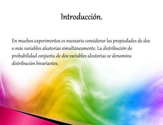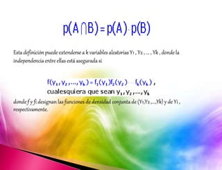 El documento habla sobre las distribuciones de probabilidad conjunta y marginal de dos o más variables aleatorias. Explica que la distribución conjunta se define mediante una función de densidad de probabilidad sobre el plano de las variables, y que las distribuciones marginales se obtienen integrando la función conjunta sobre una de las variables. También introduce los conceptos de independencia estadística de variables y de esperanza matemática.