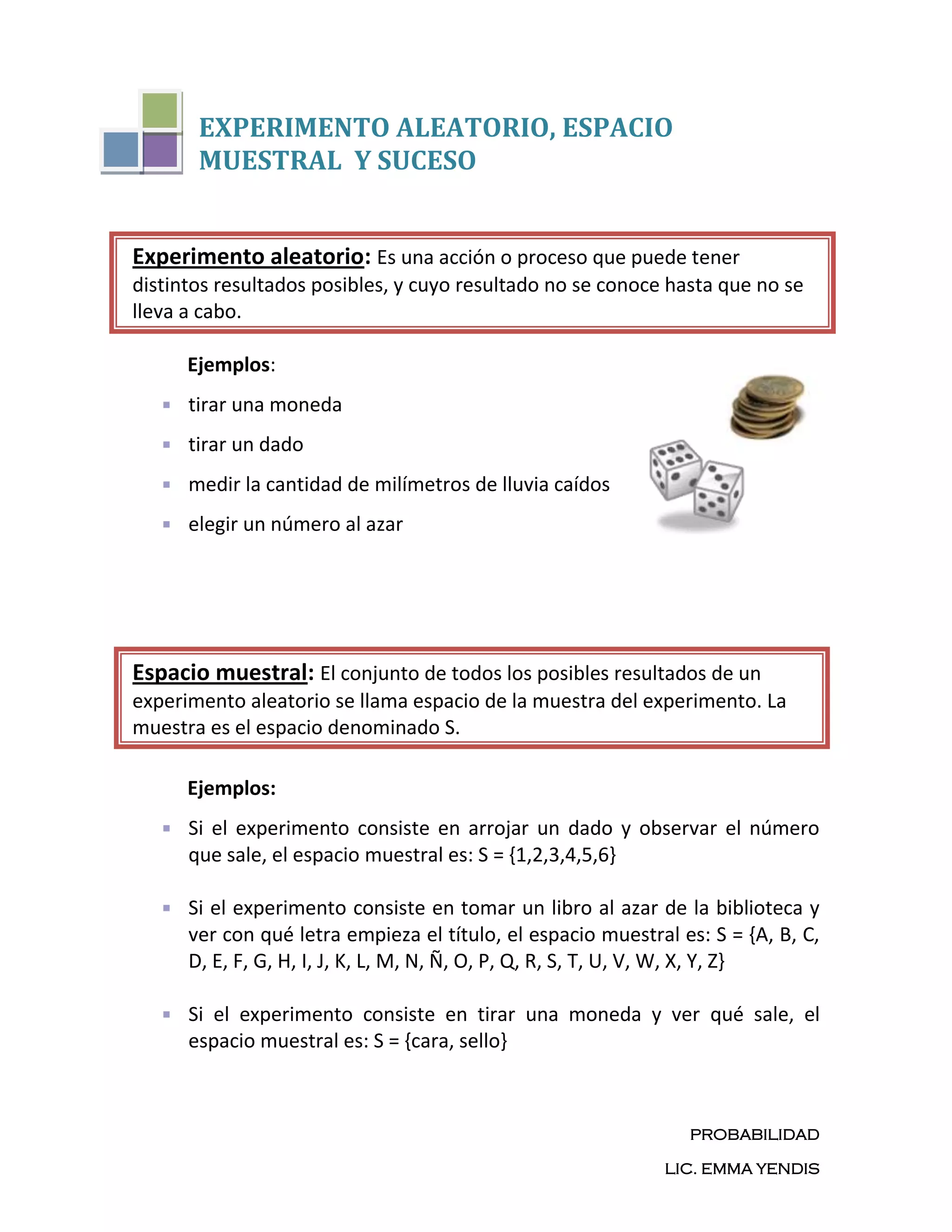 Este documento define conceptos básicos de probabilidad como experimento aleatorio, espacio muestral, suceso, intersección de sucesos, sucesos disjuntos, unión de sucesos y complemento de sucesos. Incluye ejemplos para ilustrar cada concepto y presenta la definición axiomática de probabilidad a través de tres axiomas y cuatro consecuencias.
