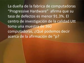 La dueña de una fábrica de computadoras afirmó que su tasa de defectos era menor al 91.3%. Un centro de investigación tomó una muestra de 360 computadoras y encontró que la afirmación era cierta, ya que la tasa de defectos encontrada fue menor al 0.3% mencionado.