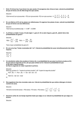 Este documento presenta 18 problemas de probabilidad con sus respectivas soluciones. Los problemas cubren temas como probabilidad condicionada, probabilidad de sucesos múltiples, probabilidad de eventos discretos y probabilidad de eventos continuos. Las soluciones utilizan fórmulas como la fórmula de la probabilidad total, la fórmula de Bayes y el teorema de la multiplicación para calcular las probabilidades requeridas.