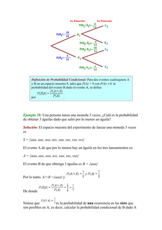 Este documento introduce la probabilidad condicional y provee ejemplos para ilustrarla. La probabilidad condicional se refiere a la probabilidad de que ocurra un evento dado que otro evento ya ha ocurrido. Se define formalmente como la probabilidad de un evento B dado un evento A dividido por la probabilidad de A. Los ejemplos incluyen calcular la probabilidad de que la segunda semilla sea blanca dado que la primera fue roja, y la probabilidad de obtener 3 águilas al lanzar una moneda 3 veces dado que salió por lo menos un águ