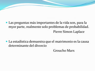 El documento presenta conceptos básicos de probabilidad y estadística, incluyendo definiciones de términos como factorial, variación, combinación, permutación, parejas, arreglos múltiples, evento, espacio muestral, independencia, condicionalidad y el teorema de Bayes. Explica cómo calcular probabilidades en espacios muestrales finitos e infinitos, así como la notación matemática utilizada en la teoría de probabilidades y conjuntos.