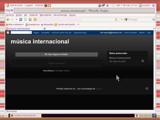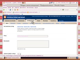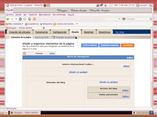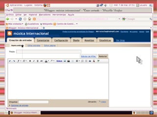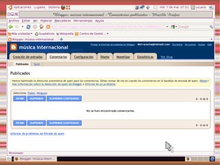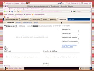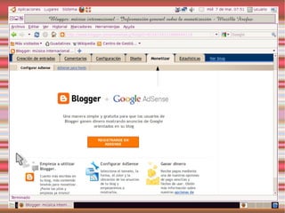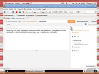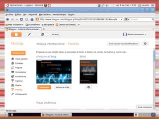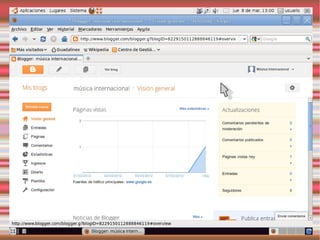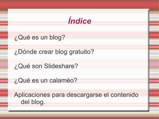 Este documento describe los blogs, incluyendo qué son, cómo crear uno gratuito en Blogger y cómo personalizarlo. También explica Slideshare y Calaméo para compartir presentaciones y documentos, y gadgets y widgets que pueden añadirse a los blogs.