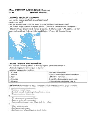 El documento presenta un examen sobre cultura clásica que cubre varios temas como la geografía y organización política de Grecia y Roma, la mitología griega, los alfabetos y lenguas indoeuropeas, la creación artística griega, los deportes olímpicos y el léxico griego y latino. El examen contiene preguntas de opción múltiple, ejercicios de mapas y de asociación de conceptos, así como preguntas de desarrollo sobre mitos, órdenes arquitectónicos y