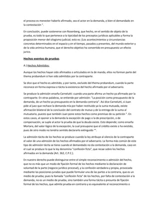 Este documento define y explica el concepto de "objeto de la prueba" en el derecho probatorio. Explica que el objeto de la prueba normalmente incluye los hechos y, en raras ocasiones, el derecho. También describe las categorías de hechos que no requieren prueba, como los hechos admitidos por la otra parte o legalmente presumidos.