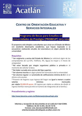 El documento describe el Programa de Becas para Estudios en Universidades de Prestigio (PROBEUP) 2013-2014. El programa ofrece becas a estudiantes del Estado de México con buen desempeño académico inscritos en licenciaturas. Los requisitos incluyen ser originario del Estado de México, no recibir otra beca, tener un promedio mínimo de 8.5, y provenir de un hogar con ingresos menores a cuatro salarios mínimos mensuales. Los interesados deben registrarse en línea y entregar document