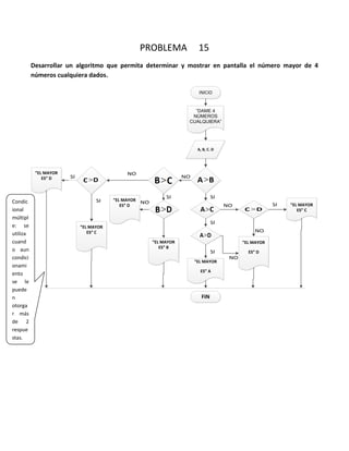 Este documento presenta un algoritmo para determinar el número mayor entre cuatro números dados. El algoritmo pide al usuario ingresar cuatro números cualesquiera y los almacena en las variables A, B, C y D. Luego utiliza un condicional múltiple para comparar los números y mostrar cuál es el mayor.