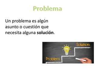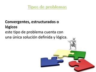 Este documento clasifica diferentes tipos de problemas y cómo se resuelven. Describe problemas convergentes que tienen una sola solución lógica, problemas divergentes que tienen múltiples soluciones posibles, problemas de razonamiento inductivos y deductivos, problemas resueltos por analogía comparando situaciones pasadas, problemas de dificultades donde la solución es conocida pero hay obstáculos, y problemas de conflicto que surgen por oposición a la propia voluntad.