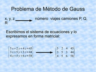 Una compañía necesita transportar 45 contenedores tipo A, 44 tipo B y 58 tipo C usando tres camiones (P, Q, R) con capacidades diferentes para cada tipo de contenedor. Usando el método de Gauss, se determina que el camión P debe hacer 5 viajes, el camión Q debe hacer 4 viajes, y el camión R debe hacer 3 viajes para transportar todos los contenedores.