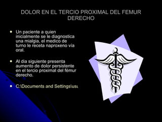 El paciente presenta dolor persistente en el tercio proximal del fémur derecho tras un diagnóstico inicial de mialgia y tratamiento con naproxeno. Los síntomas como dolor óseo, fiebre y malestar general sugieren un diagnóstico de osteomielitis. La osteomielitis es una inflamación del tejido óseo causada usualmente por una infección bacteriana. Se recomienda realizar radiografías y controlar el dolor e inflamación con medicamentos, así como reposo y masajes terapéuticos.