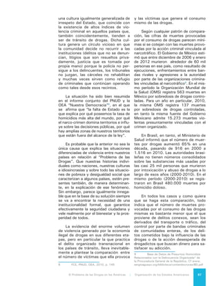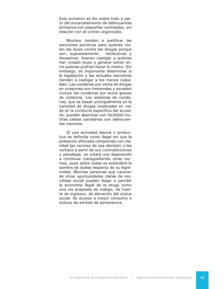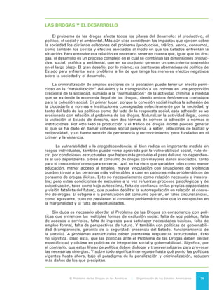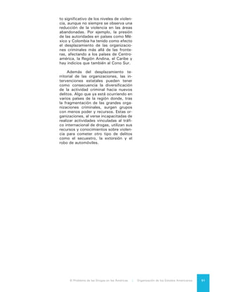 Este documento presenta una introducción al informe "El Problema de las Drogas en las Américas" publicado por la Organización de los Estados Americanos. Resume el contexto del debate sobre las políticas de drogas en las Américas, reconociendo tanto los puntos de consenso como los desacuerdos. También describe la metodología y estructura del informe analítico, el cual examina varios aspectos relacionados con la producción, tráfico y consumo de drogas en la región.