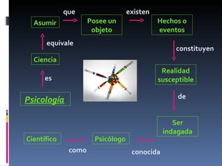 El documento discute la falta de consenso sobre el objeto de estudio de la psicología a lo largo de la historia. Varios autores han propuesto diferentes objetos como la conciencia, el comportamiento observable, los procesos mentales y el inconsciente. Actualmente, la psicología se considera una ciencia heterogénea y plural sin un paradigma unificador debido a esta multiplicidad de enfoques sobre su objeto de estudio.