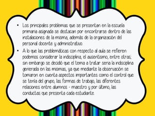 El documento describe problemas de indisciplina en una escuela primaria. Se eligió este tema debido a la importancia de la disciplina para el aprendizaje. Las posibles causas incluyen el contexto familiar urbano marginal y hogares donde los padres son jóvenes con muchas responsabilidades. Las consecuencias son bajo rendimiento académico y descontrol del salón. Los docentes deben buscar estrategias para mantener el control y crear disciplina de forma motivadora.