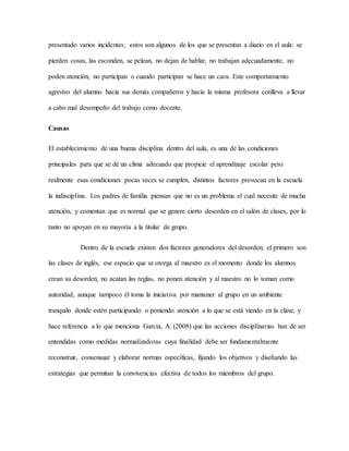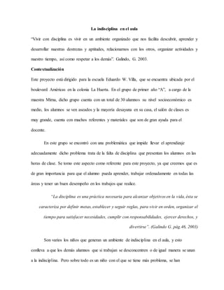 La indisciplina en el aula es un problema en una escuela primaria donde un grupo de 30 estudiantes muestra falta de disciplina que impide el aprendizaje. Algunos estudiantes se pelean, no prestan atención, esconden cosas y distraen a los demás. Un estudiante en particular causa más problemas y distracciones. La falta de disciplina se debe a factores como la falta de autoridad del maestro de inglés y la falta de apoyo de los padres. Esto tiene como consecuencia que los estudiantes no presten atención y aprendan. La investig