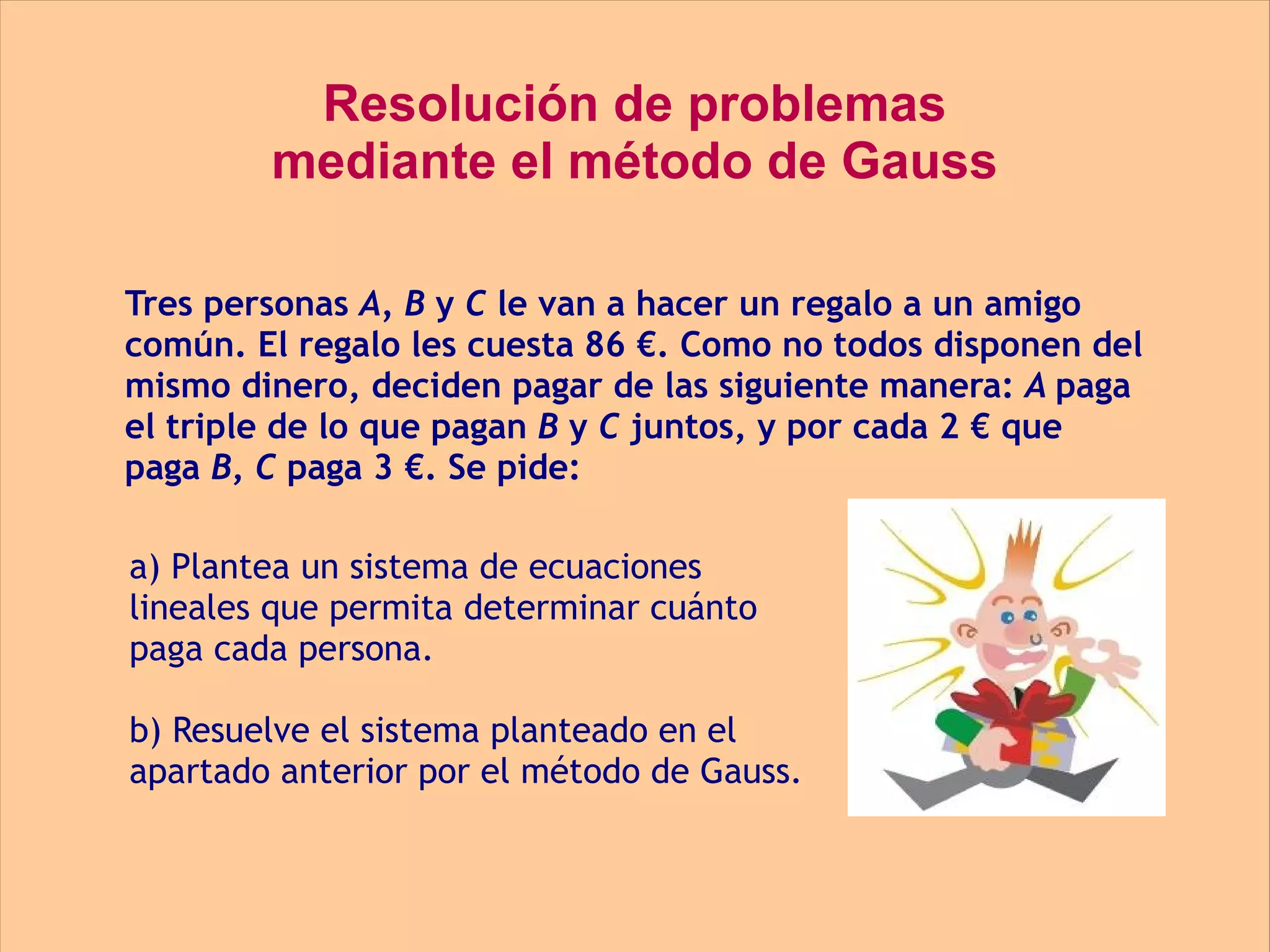 Tres personas (A, B y C) comparten el coste de un regalo de 86€. Se plantea un sistema de ecuaciones para determinar cuánto paga cada una. El sistema se resuelve usando el método de Gauss, obteniendo que A paga 64,5€, B paga 8,6€ y C paga 12,9€.