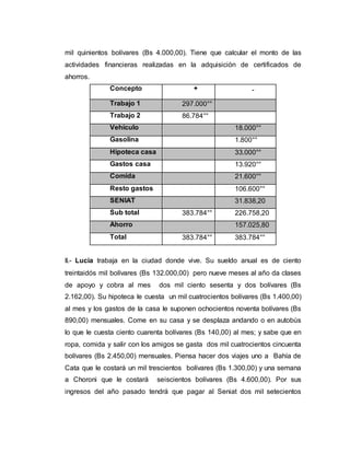 Este documento compara la situación financiera de tres personas (Eduardo, Lucía y la pareja Carlos y Susana) calculando sus ingresos, gastos, impuestos y ahorros. Se determina que Eduardo tendría un superávit de casi 82 mil bolívares incluso después de un viaje costoso, mientras que Carlos y Susana necesitarían ajustar su presupuesto para tener un hijo. Se recomienda que Carlos y Susana declaren sus ingresos por separado para pagar menos impuestos.