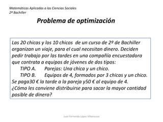 El documento describe un problema de optimización en el que un grupo de estudiantes necesita maximizar el dinero ganado trabajando por las tardes en encuestas. Pueden formar parejas o equipos de 4 personas. Se debe determinar la distribución óptima que maximice la ganancia total sujeta a restricciones en el número de estudiantes. La solución es formar 5 parejas y 5 equipos de 4 personas para una ganancia máxima de 400 euros.