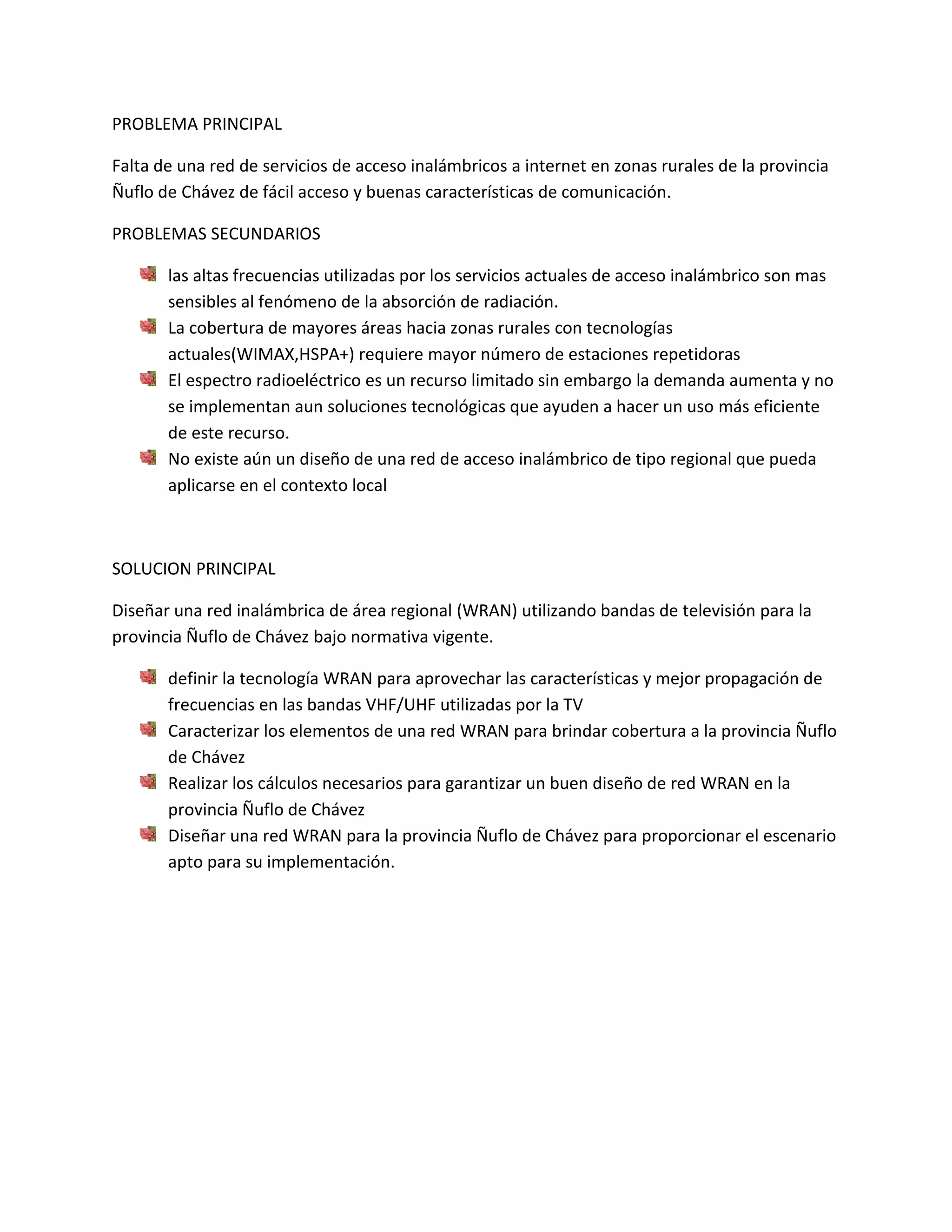 El documento describe los problemas de falta de acceso inalámbrico a Internet en zonas rurales de la provincia de Ñuflo de Chávez, debido a la alta absorción de radiación a frecuencias altas y la necesidad de más repetidoras para una mayor cobertura. Propone diseñar una red inalámbrica regional (WRAN) que utilice bandas de televisión para aprovechar su mejor propagación, caracterizando sus elementos y realizando cálculos para garantizar un buen diseño de red que proporcione cobertura a toda la provincia