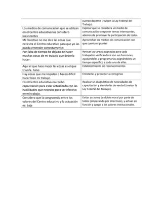 El documento describe varios problemas en el Centro educativo como objetivos ambiguos, falta de supervisión y flexibilidad, asignación de tareas inadecuadas y falta de incentivos. Los empleados se sienten desmotivados y algunos consideran renunciar. La propuesta de solución incluye establecer objetivos claros, implementar mecanismos de supervisión y reconocimiento, asignar tareas apropiadas, desarrollar una cultura de servicio y proveer capacitación y recursos para mejorar el desempeño.